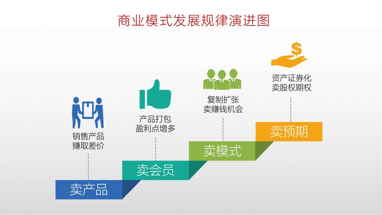 根据多年对商业模式的观察、研究和思考,我认识到,一家从事服务行业或者零售行业的公司,如果它足够的幸运能够走完一个完整的发展周期,那么从它开始创立,到发展壮大走向一个集团公司或者上市公司,是有一般规律的。我把它称之为商业模式的一般演进规律,它的发展基本上可以分为四个阶段,分别是:卖产品、卖会员、卖模式、卖预期,我把这个过程绘制成了商业模式发展规律演进图: