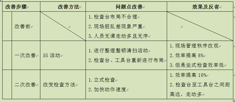 在这个阶段的改善活动取得成效之后,也许有人会认为问题已经彻底解决,不用再进行改善活动了。但是,我们说改善并没有结束,因为事物或工作(4M)总是发展变化的,某一时段的改善都有其局限性,只要事物或工作依然存在,我们就要不断改善。表4-20是一个检查效率持续改善的事例。