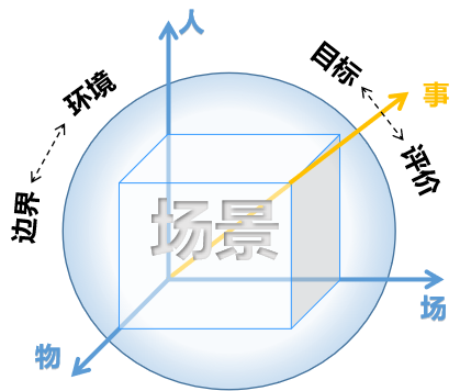 数字场景识别与界定的逻辑框架,能帮助我们更简单而全面的认识目标场景。逻辑框架主要包括了场景的八大要素,即人、事、物、场、目标、边界、环境和评价。“人”的要素是数字场景的灵魂,每个数字场景都要是为人服务的,同时有人在提供此服务的过程中受益;“事”的要素是数字场景的核心,只要有“事”的存在,就可以形成一个场景,并考虑其数字化;“物”是价值的载体,各类价值的实现往往伴随着产物的形成或形式转变;“场”是数字场景的载体,数字场景在此场所中运行,可以是物理场所,也可以是数字场所;“目标”是场景存在的原因,继承了组织对此场景的期许和任务;“边界”确定了场景的范围,在认识场景、改造场景的过程中十分关键;“环境”是多方对此场景产生作用的集合,既包括内部条件,也包括外部环境;“评价”既是目标的价值绩效分解,也是环境的变革能力评价,对场景价值和状态的把握做了重要补充,如图3.1所示。