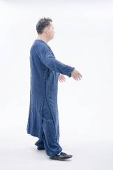 6.右脚为轴心,带动腰胯向右旋,同时左脚向正前方荡出,脚跟点地。右手握拳于左胸前两个拳头宽的距离处,左长手由下向上成半圆荡出成为竖掌;左肘眼放于右拳眼上方,两两微微贴合。