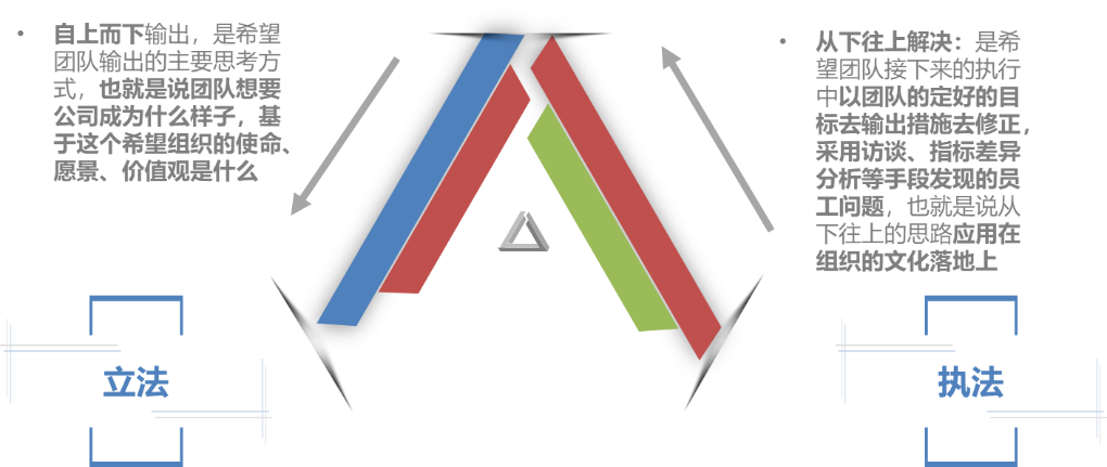 重塑文化过程包括立法和执法的原则梳理。立法,是一种自上而下输出,是希望团队输出的主要思考方式。也就是说,团队想要公司成为什么样子,基于这个希望组织的使命、愿景、价值观是什么;执法,是一种从下往上解决的思路,是希望团队接下来的执行中以团队的定好的目标输出措施去修正,采用访谈、指标差异分析等手段发现员工的问题。也就是说,从下往上的思路应用在组织的文化落地上。如图4-3所示。