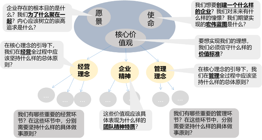 企业文化理念体系要素之间存在一定的关系,可参考图4-5。在探索符合组织的企业文化理念体系要素的关联中,我们要思考组织中有哪些重要的管理环节?在这些环节中,分别需要坚持什么样的具体做事原则?愿景解答了组织相聚的理由,使命解答了宏伟蓝图目标,核心价值观解答了必须信守的价值标准,并在三者之下,带来经营理念、企业精神、管理理念等实践活动中的二级标准原则。