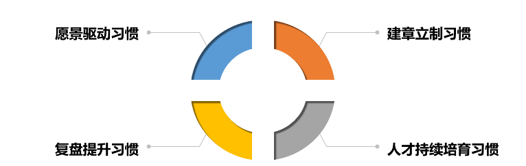 组织行为习惯是组织发展中各类工作实践经验的汇集,这些实践经验在企业发展中发挥了重要作用。企业的组织行为习惯主要包括愿景驱动的习惯、建章立制习惯、人才持续培育习惯、复盘提升习惯。如图6-2所示。