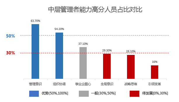 从A银行的团队报告来看,中层管理者团队在管理意识、组织协调方面处于相对优势水平,盘点中处于高分的管理者在中层管理者团队中分别占63.7%和54.2%。而在全局意识、战略思维以及引领变革方面处于相对劣势水平,占比分别为29.3%、28.1%以及16.0%。