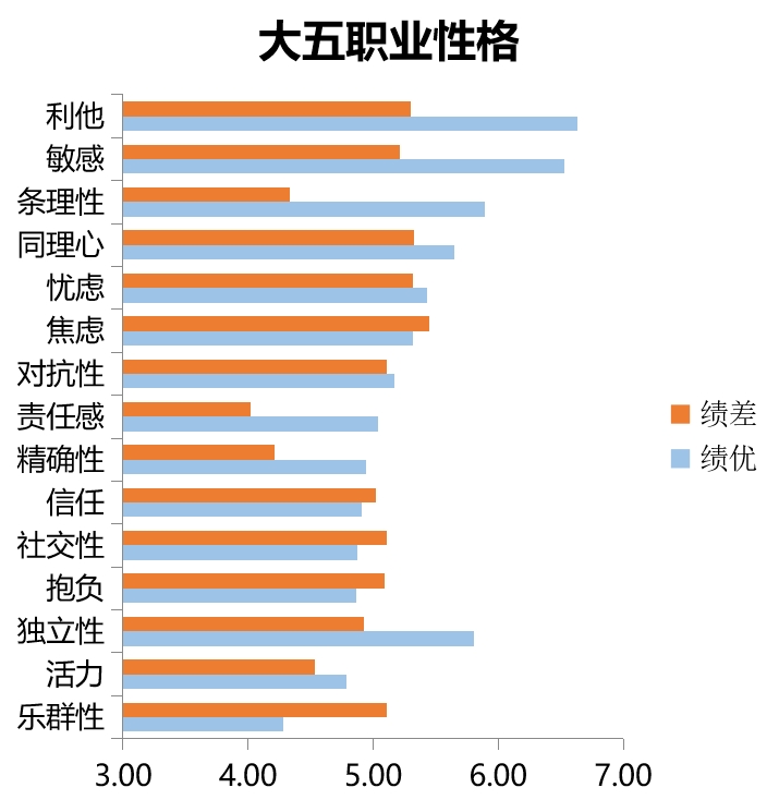 对A银行中层管理者团队进行大五职业性格子维度的绩优绩差比较,结果绩优绩差人员分别在利他、条理性、责任感、精确性、独立性上得分上有显著差异(得分绝对值大于1分)。