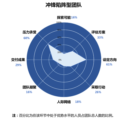 为了实现共同目标,团队需要经历八个阶段,这些阶段相互影响、循环往复,形成团队工作环。每个团队成员对团队工作都有着独特的贡献,这些独特的贡献与每个人的性格息息相关。根据工作环测评结果分析,A银行团队为冲锋陷阵型团队,该类型团队适合在高压、方向明确的情况下进行项目开展与业务扩张活动;这与A银行转型方向有以下差距: