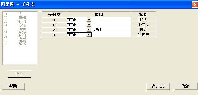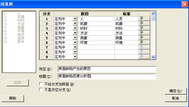 (3)在“原因”选择适应列,在“效应”输入“表面缺陷产生的原因”,在“标题”输入“表面缺陷因果分析图”,有子项目原因细化,点击“子分支”,然后点击“确定”,如图1-5、图1-6所示。