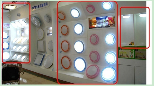 在终端陈列中一定要杜绝两种现象:一种是产品缺失,另一种是样品老化或者损毁。样品缺失给人的印象是清盘甩卖、不再经营或者是卖给顾客旧货;样品老化或者损毁给顾客产品品质不好的印象和联想。好的陈列自身会说话,它就是终端的活广告。另外,要用灯光烘托、突出产品陈列,使产品展示在终端显得与众不同,让消费者在卖场中一眼就看到我们想突出的产品。如图5-2(亮灯部分)所示。