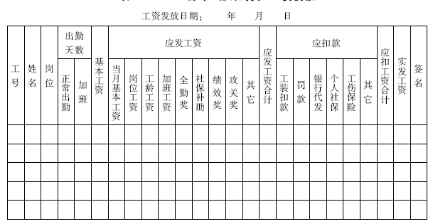 支付方式:分为现金支付和银行代发两种,由员工本人根据当月所发工资进行领取或打入个人银行账号;