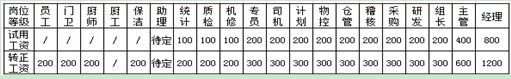 5.1员工、门卫、厨师、厨工、保洁、统计、质检绩效无试用期;机修、专员、司机、计划、物控、仓管、稽核、采购、研发、组长绩效试用期工资比转正后工资低100元;主管绩效试用期比转正后工资低200元;经理绩效试用期比转正后工资低400元,如表2-3所示。