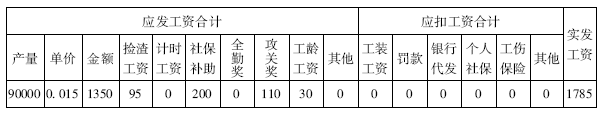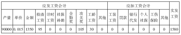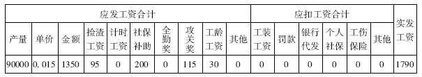 表2-9 计件员工XX出勤为21天的工资计算表