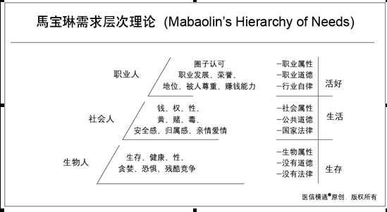 3.社会人体现的需求是由“生活需求”延伸的,除了“活着”以外,还有对安全感、归属感、亲情爱情的需求,当然还有对“钱权性”和“黄赌毒”的需求。社会人体现了人性从本质到修饰的一面,说它本质是因为有“钱权性”和“黄赌毒”,说它修饰是因为要受到公共道德的教化和国家法律的限制。