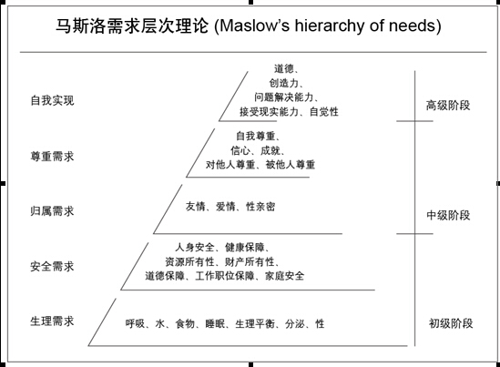 (4)马斯洛和其他的行为心理学家都认为,一个国家多数人的需要层次结构,是同这个国家的经济发展水平、科技发展水平、文化和人民受教育的程度直接相关的。在不发达国家,生理需要和安全需要占主导的人数比例较大,而高级需要占主导的人数比例较小;在发达国家,则刚好相反。我国的企业界人士也多用它来指导企业实践,包括管理实践和营销实践。