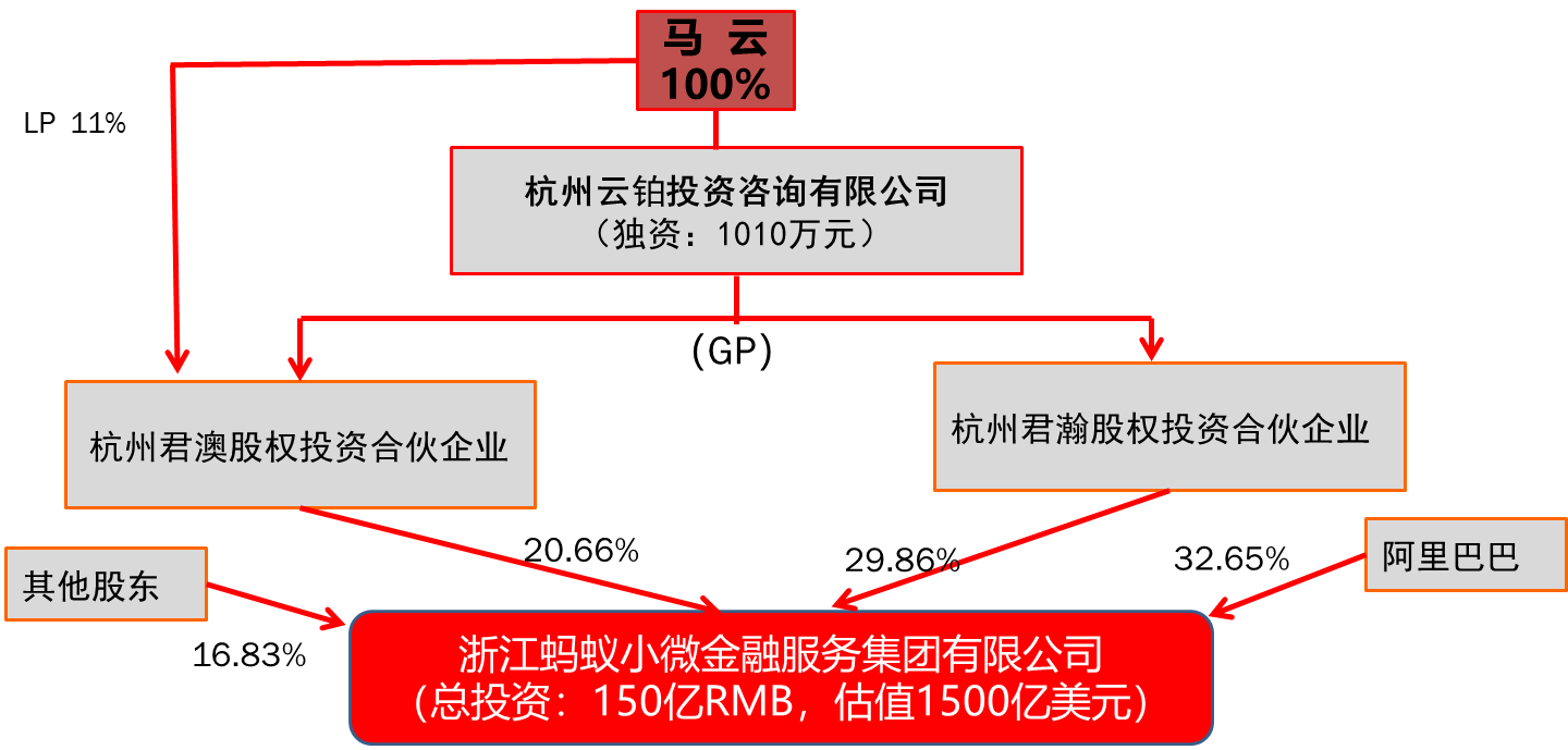 马云独资控制杭州云铂投资咨询有限公司(以下简称“杭州云铂”),而这家公司以GP身份同时获得杭州君澳股权投资合伙企业、杭州君瀚股权投资合伙企业所持股权的投票权,成为蚂蚁金服的大股东、实际控制人。