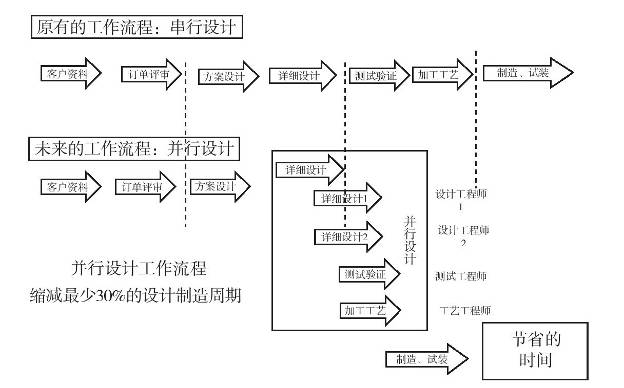 并行工程的方法有全三维设计,协同设计,MBD(ModelBasedDefinition,基于模型的工程定义),流程并行,流程并行工程如图4-4所示。
