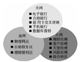 所谓的“三网合一”,即天网、地网、人网的合一。天网指电子银行、自助银行、信用卡交叉营销、手机银行、数据库营销等核心虚拟渠道;地网指物理网点、自助服务区、理财便利店等营销实体渠道;人网指理财经理、客户经理、风险经理、大堂经理、综合柜员等一线网点核心队伍主动营销渠道。“三网合一”模式如图4-18所示。