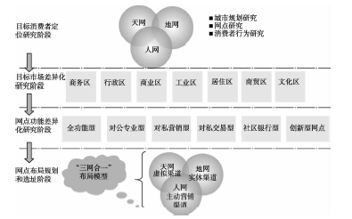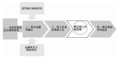 精品银行网点规划布局是基于“天、地、人三网合一”渠道研究模型,它分为前期调研、网点规划、网点布局和选址四大板块及若干步骤。如图4-20所示。