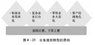 该分行提出:按照“前(台)简后(台)繁、下(级行)简上(级行)繁”和“高柜业务简单化、复杂业务后台化、零售业务大堂化、客户经理角色化”的原则,实现“凡是银行能做的不要客户做,凡是后台能做的不要前台做,凡是客户一步能完成的不分两步操作,凡是机具和系统能办理的不到柜面办理,凡是能集中的不分散办理”。
