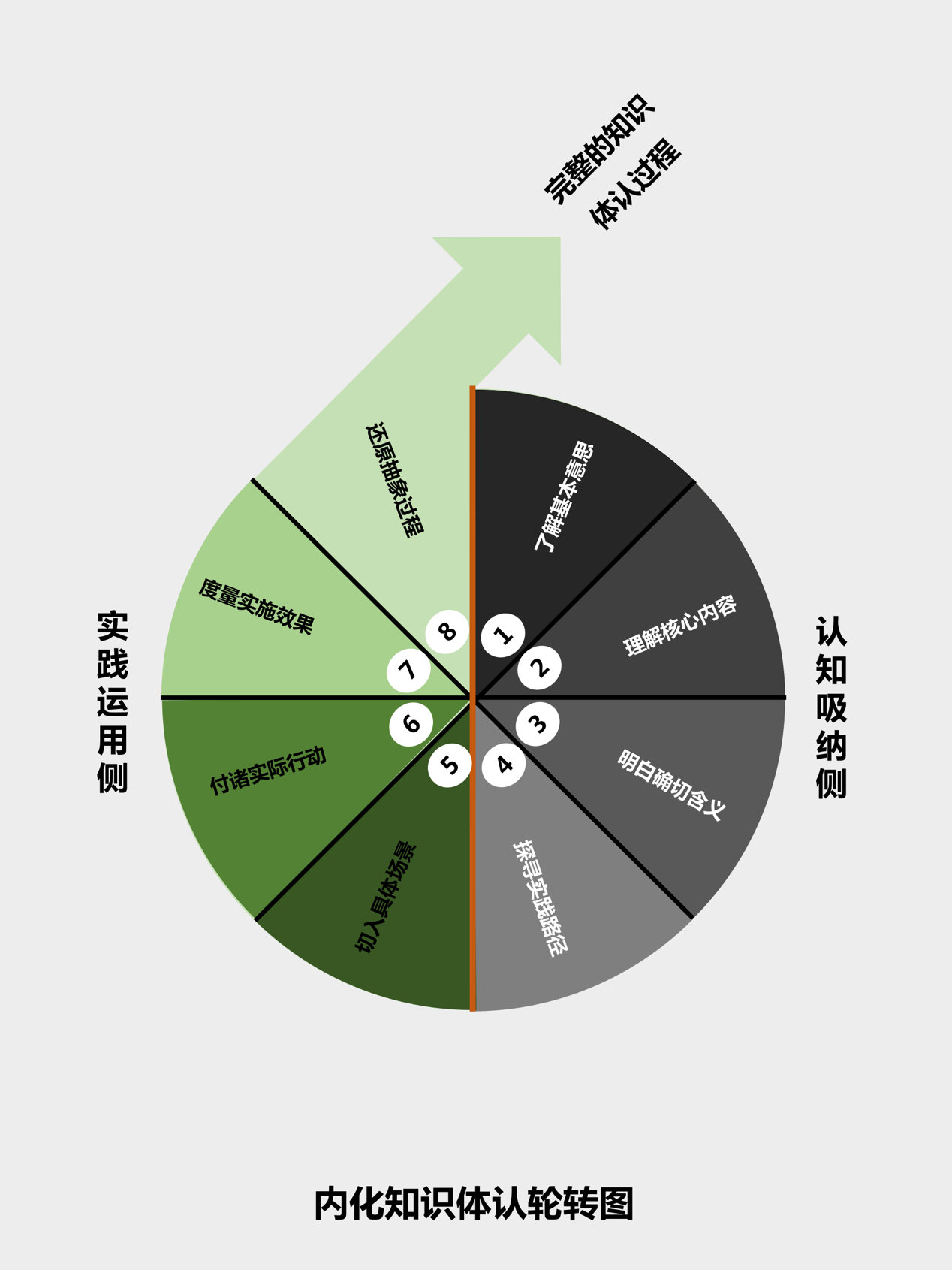 内化知识体认是一个持续轮转的过程,分别是认知吸纳侧的四个步骤和实践运用侧的四个步骤,依次是: