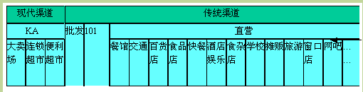 从表2-1可以看出,可口可乐公司对渠道的总体划分是传统渠道和现代渠道,反映了传统渠道在中国的快消品市场上所占的比例。不少外资企业就是因为忽视了传统渠道,才退出中国市场。渠道虽然很多,但可归结为KA(Key Account,即重点零售客户)、批发、101或CSS(即可口可乐的传统零售点销售服务系统)和直营四类渠道,这四类主渠道构成了可口可乐公司渠道系统的主框架。