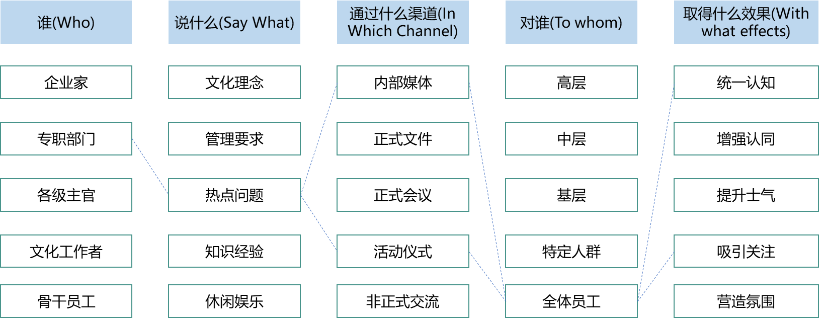 有一段时间,互联网公司“996”工作制,在很多企业成了热议的话题,有人反对,有人赞同,这时就需要统一认知。参考5W传播模式,为了实现统一认知的目标,可以由企业文化专职部门针对热点问题举办自下而上、全员参与的研讨活动,也可以通过内部媒体发表解读文章,向全体员工阐明公司导向。