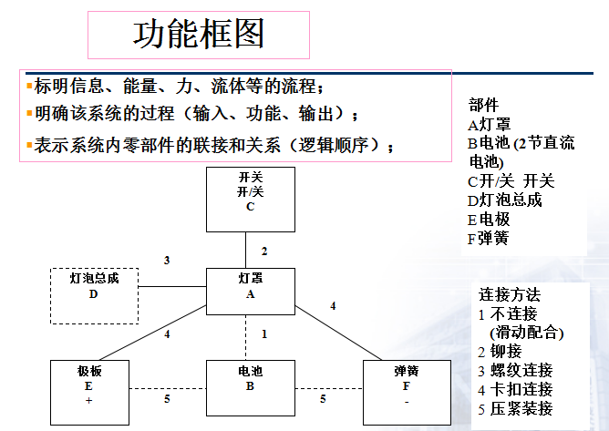 以下是系统灯的功能方块图,子系统包括灯泡、开关、电池;部件包括灯罩、极板和弹片。