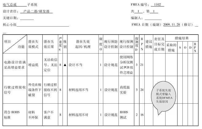 做子系统DFME,首先要找到系统赋予它的功能性能要求,比如GPS天线这个系统,它所赋予子系统电气总成的功能是电路设计需满足高增益要求,如果设计不当,则会导致匹配不佳,增益过低。失效模式就是增益过低,失效后果是收不到信号或信号弱,这来自系统DFMEA的失效模式。那么失效原因就是设计不当。