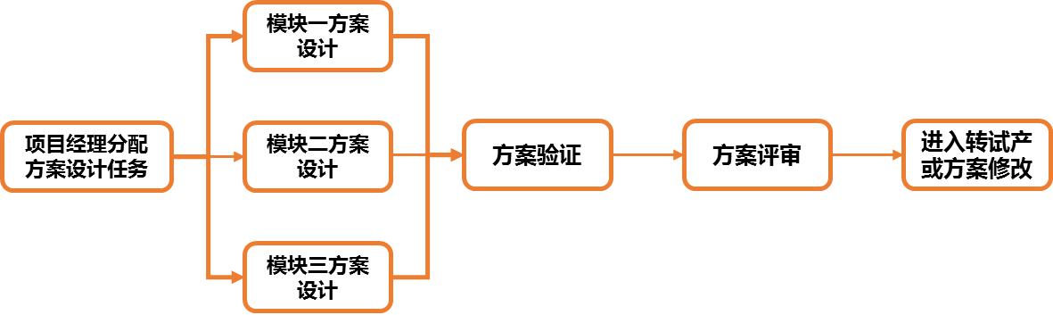 05 | 项目经理 | 如果评审通过则进入下一个开发环境,如果评审不通过则主导进行方案修改 | 8H | 输入:评审结论 输出:转试产或修改方案 |