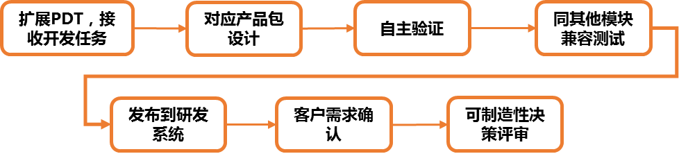 我们可以看到子模块的开发流程包括自主验证、同其他模块的兼容测试,然后是同客户的需求对接确认,最后是决策评审。这样的开发流程设计相对来说比较严谨,如果能通过研发系统固化这些流程会取得更好的效果。
