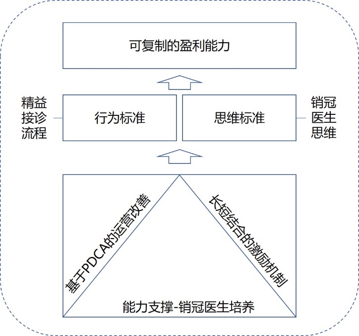 我们在精益思想的指导下,结合口腔行业现状,设计了一套模式——精益口腔运营管理系统,醒客堂在咨询实践中运用这套系统辅导了很多门诊,有的实现年度业绩翻倍,有的实现利润翻倍,也有一些门诊通过这个过程打好了管理基础,开始稳步裂变。图2-1就是这套系统的基本逻辑。
