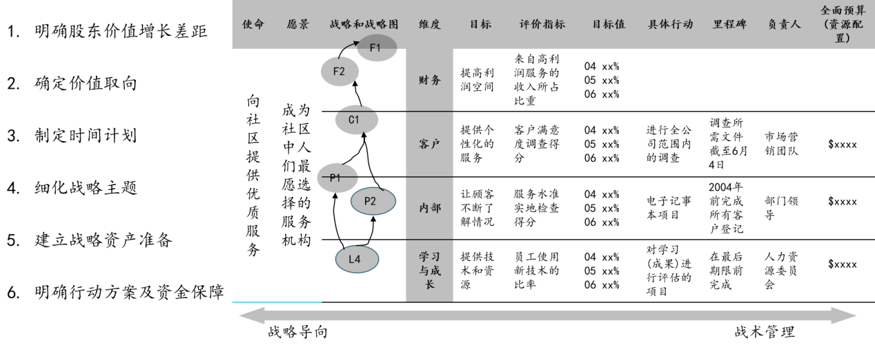6S管理体系是华润由宁高宁首创的,它包含了战略规划,战略规划由“6步法”组成。BSC把长期的战略和评价指标与更具体的战术计划及预算相联系,来支持一个完整的战略管理系统,如图3-17所示: