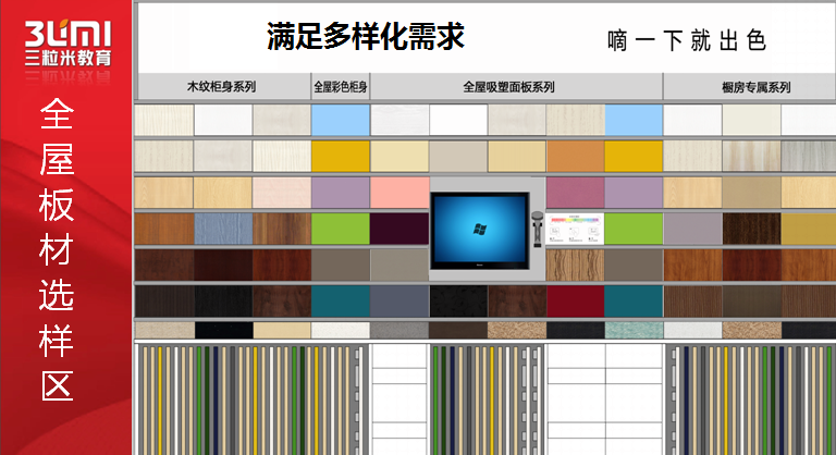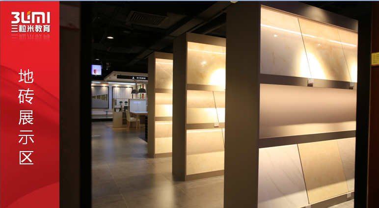 接着看产品陈列,包括衣柜橱柜,接着是瓷砖木地板洁具等主材,最后看三个样板间。洽谈区散落在整个动线中,整个动线最后,是一个集中洽谈区,有LED大屏和舞台,便于搞活动。