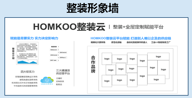1.对消费者而言,看得见、摸得着的“整装+全屋定制”体验尤为重要,家装全流程的体验必须依赖于展厅,凡是加入HOMKOO整装云的成员装企,首要任务就是建立一个整装展厅。