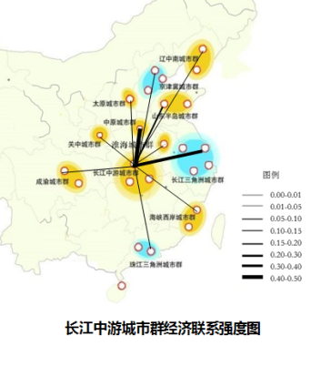 从城市群经济联系强度图可以看出,长江中游城市群和中原及长三角城市群联系最为密切,其次与山东半岛城市群联系较为密切。