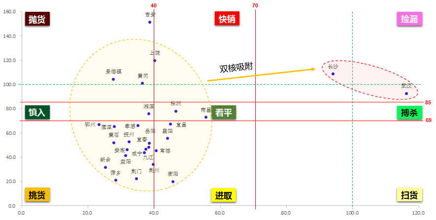 核心城市武汉、长沙处于捡漏区,武汉的城市基本面强,发展潜力较大,最近几年供销平衡,应拓宽拓展方式和地点,从外围市场获取优质的大型地块;长沙市场略显过热,近期土拍市场采用摇号,宜集中精力,围剿2-3块;