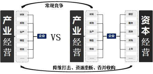 产业竞争,思维和行动都局限在产业层面,要想提升企业竞争力,只能在研供产销等产业范围内做文章。这面临三个问题:一是发挥空间有限;二是资金、资源不足;三是竞争威力不够。