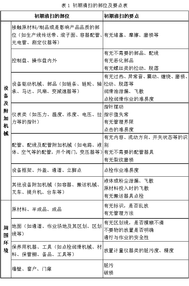 所谓初期清扫,就是要求员工带着抹布进行设备的清扫。虽然说是清扫,但绝不只是使设备干净而已,而是通过清扫时作业人员与设备的接触,找出隐藏在设备内部的不正常现象。也就是说,清扫是在为设备做健康诊断。因此,我们必须充分认识清扫的目的就是进行设备点检,这种点检对于维持设备长寿命健康运行是十分重要的。