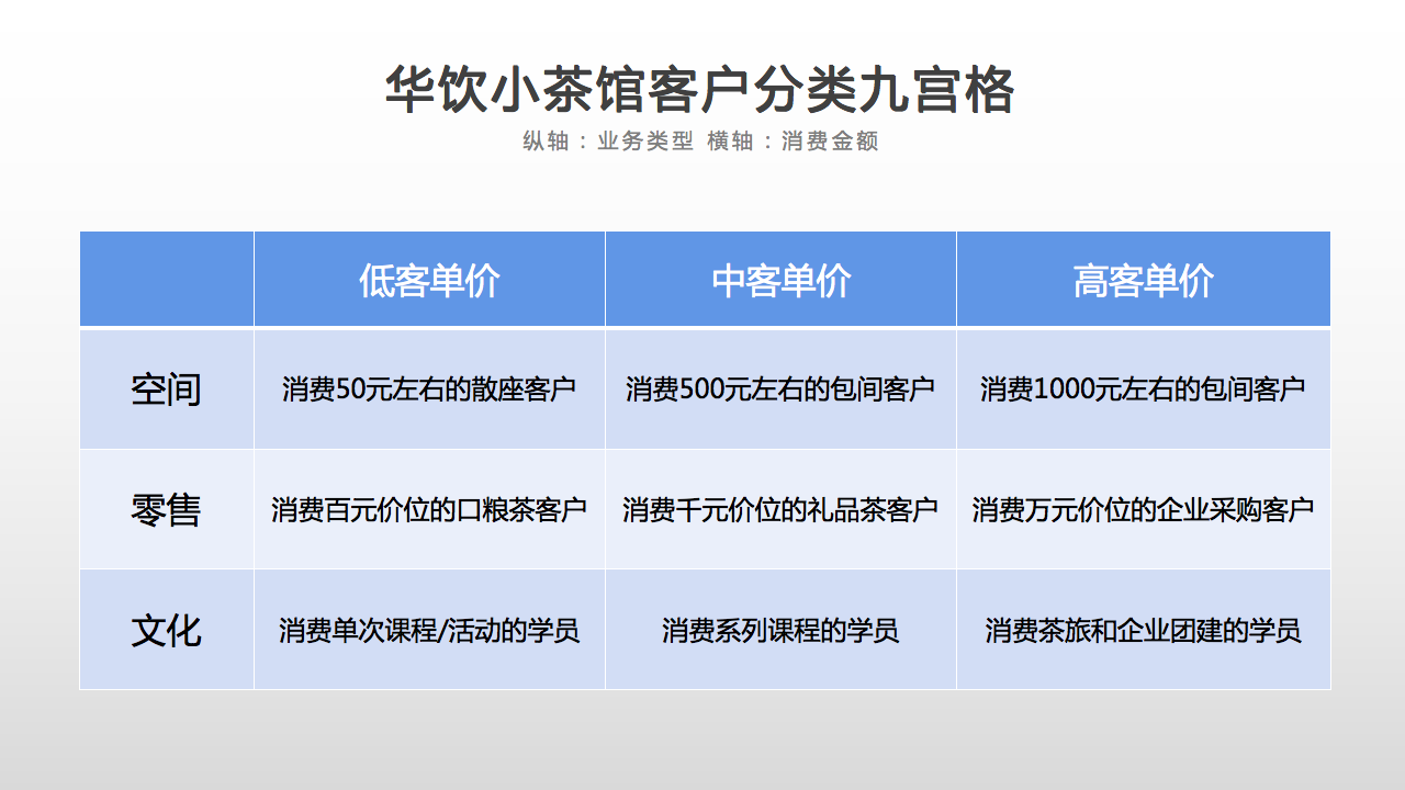 按照这个思路,我们来做一个最常见的二维法分析,就得出一张图表,它的纵轴是业务类型,横轴是客单价高低,我们就划出了华饮小茶馆客户分类的九宫格图: