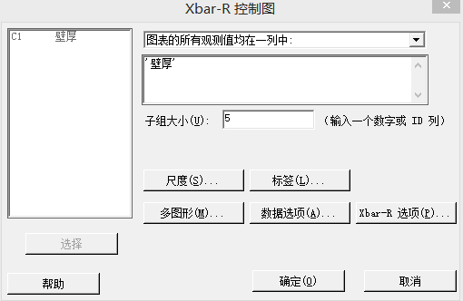 (2)指定“图表的所有观测值均在一列中”为“壁厚”,指定“子组大小”为“5”,如图1-25所示。指定也可根据数据选择“子组的观测值位于多列的同一行中”。