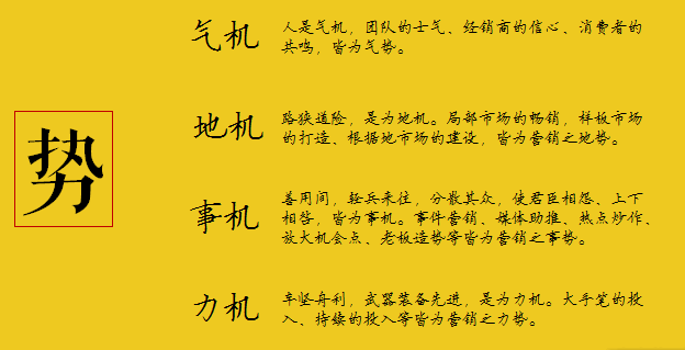 气机,从人的士气角度创造,用一种方式鼓舞团队士气,增加经销商的信息,或通过情感引发消费者的共鸣,均是“入势”的方式之一。