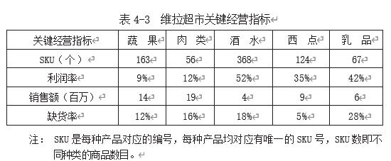 表4-3 反映了维拉超市年度的品类、利润率、销售额及缺货率。