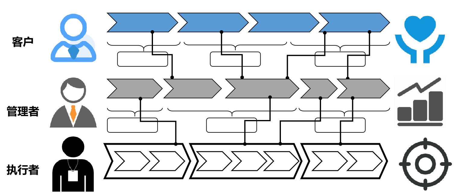 在企业目标愿景的指引下,从业务入手开展价值流设计,分析围绕利益相关者的业务活动中价值效益创造、传递与交付的过程实质,如图3.10。识别价值触发者(直接客户、主要执行者、其他价值传递角色等)与其价值主张,开展对端到端客户旅程的细化,对应寻找执行者与客户的价值触点,形成并总结内部价值活动,参考价值发现、价值确认、价值创造、价值交付的基本逻辑,划定价值流阶段,形成完整的价值流设计。