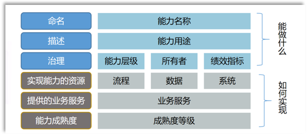 基于业务单元聚合、具有独立目标的各价值流阶段,开展业务能力设计,识别需要优化、新建的能力需求,从命名、描述、治理方式、实现能力所需资源、能够提供的业务服务、能力成熟度等多方面对业务能力进行定义与拆解,直至拆解为不可分解的最小能力单元,借鉴华为数字化转型之道,最小能力单元的定义如图3.11。