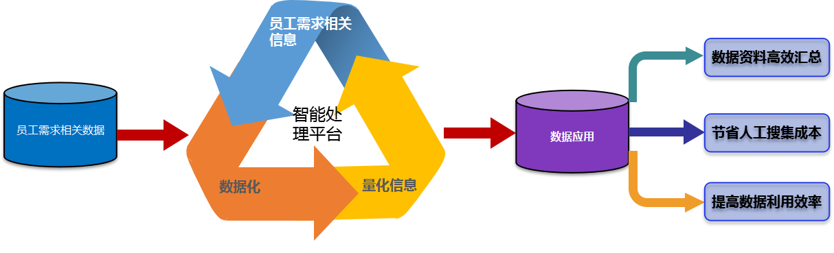 与员工息息相关的各项数据已经存在,也能够进行收集整合。但由于各项数据统计口径不同,难以得到有效的分析利用。这就要求我们利用互联网技术,搭建专业化科学化的信息处理平台,数字化对接与员工需求相关的各个方面的数据来源,实现多方面信息的输入与转换,将采集到的员工需求信息数据化,并转化成可以直接进行统计分析的量化信息。依托这一信息处理平台,员工的各种数据资料不仅可以得到高效的汇总,节省人工搜集的成本,还能够实现智能化数据处理分析,提高数据利用效率。