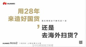 在满足使用需求的基础上,成功地抓住了国人的心理需求。如华为Mate7依靠国人的“支持国货”的心理,加上不错的手机配置、手机工艺,得以在国内大卖。同时,完成了从“中国制造”到“中国智造”的形象升级。如Mate8系列的广告词——“用28年来造好国货,还是去海外扫货”,如图3-12所示。