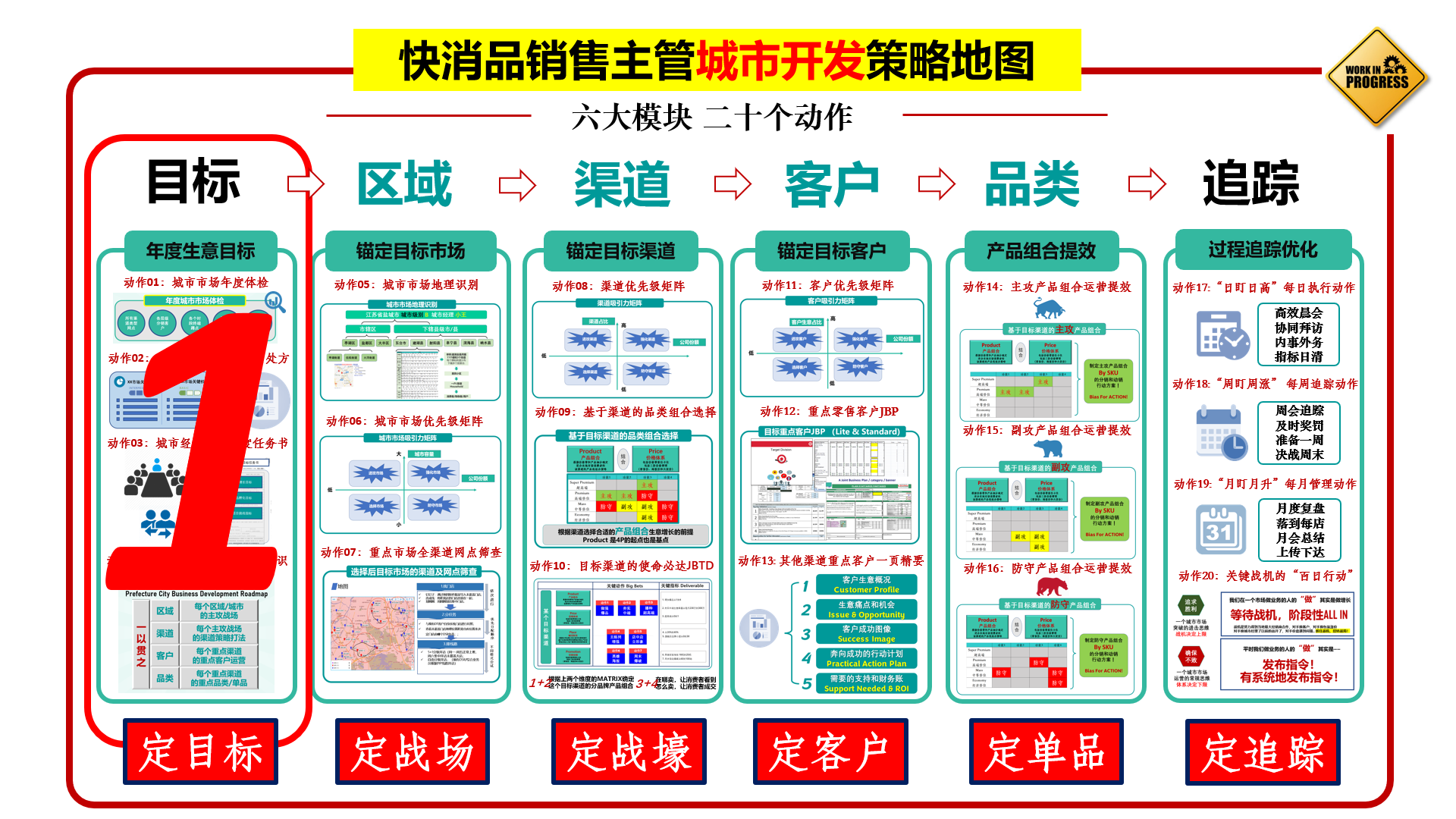 “定目标”包含四个标准动作,分别是城市市场年度体检、城市生意诊断及计划、城市经理/主管签署年度任务书和开发策略内训。
