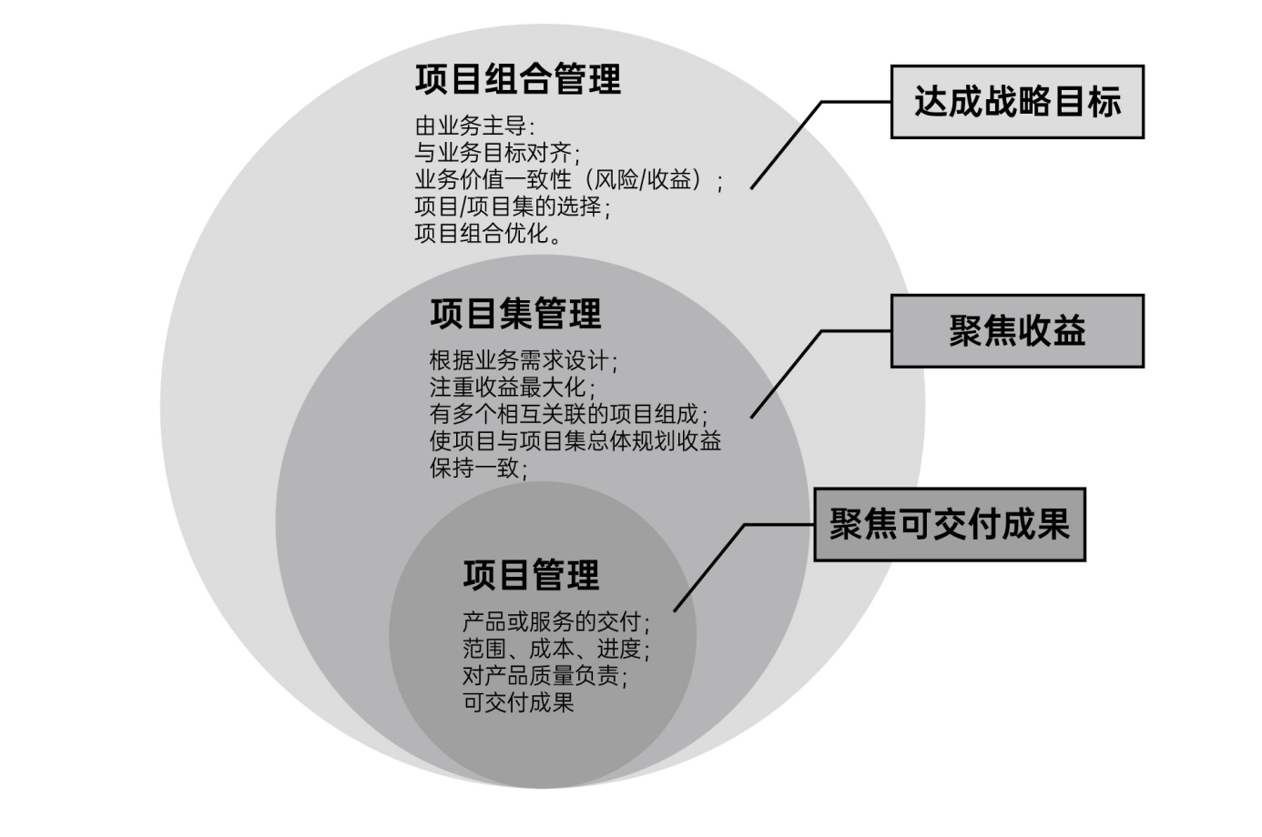 成功标准 | 成功是由产品和项目质量、及时性、预算遵从性和客户满意度来衡量 | 衡量成功的标准是项目集在多大程度上满足的所期待的需求和收益 | 衡量成功的标准是整个项目组合的投资绩效和收益实现 |