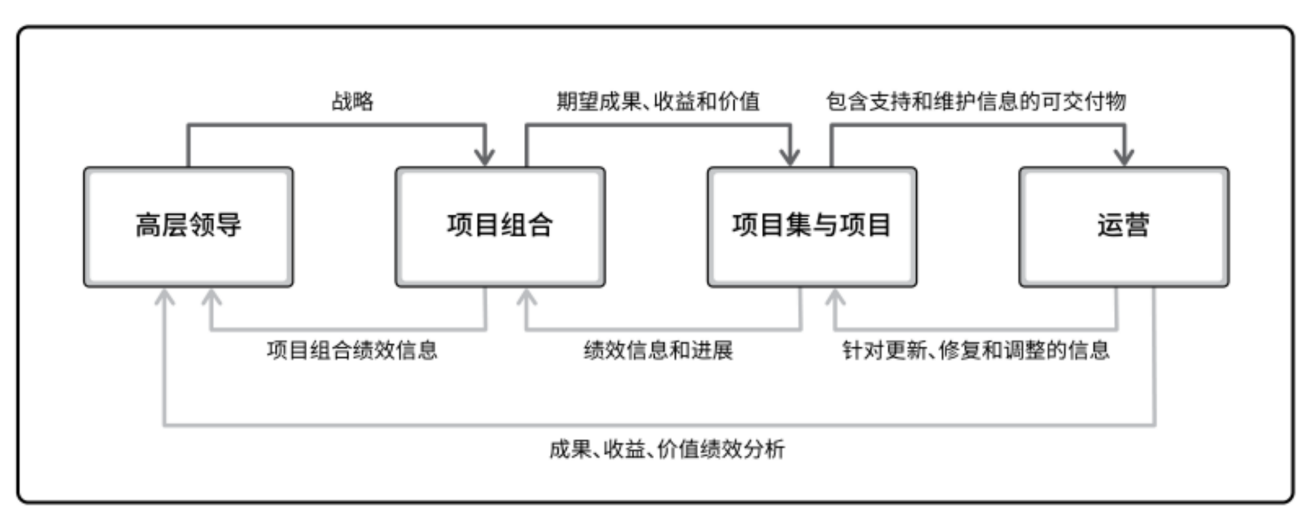 图中展示出了从高层领导到项目组合,再到项目集和项目,最后再进入运营的整个信息流转的情况,上面的箭头表示上层把战略分解再一层层下放到执行层,下面箭头表示对可交付成果进行调整、优化和更新。让计划和实际绩效不断地迭代,实现组织效益最优的结果。这样做的好处是:战略下达之后能更快地交付市场上进行验证,验证的结果也能更好地反馈战略执行是否正确。