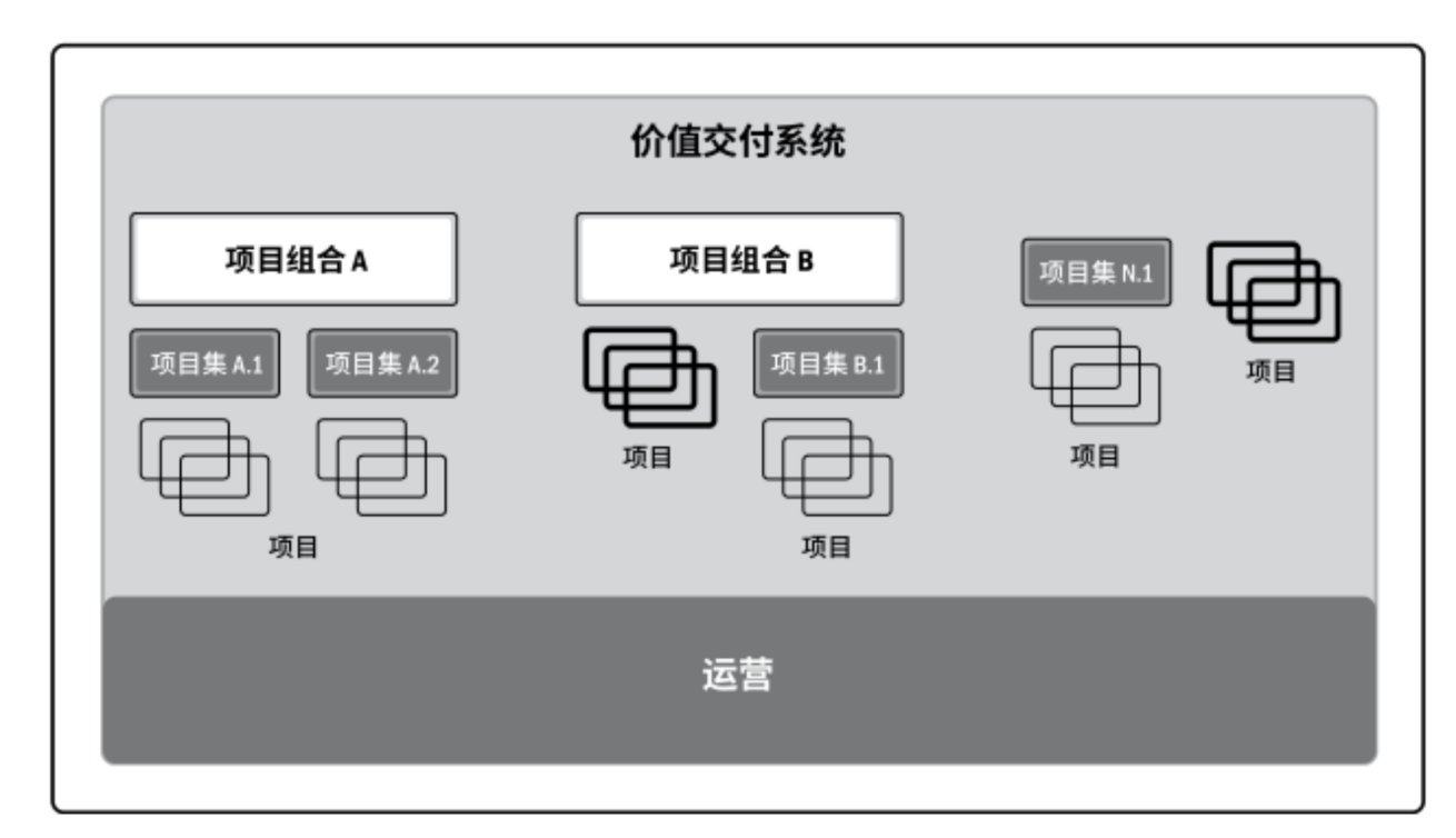 从图中可以看到,一个个项目单元组成了项目集,不同的项目集和项目组成了项目组合,项目组合A、项目组合B和其他的项目再加上运营,组成了整个价值交付系统。