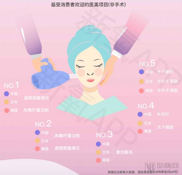 从最受消费者欢迎的非手术医美项目看,全球消费者的喜好非常相近,前5大受欢迎项目里都包括透明质酸填充、肉毒杆菌注射、激光脱毛、光子嫩肤。